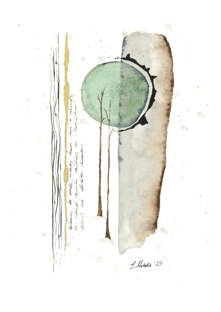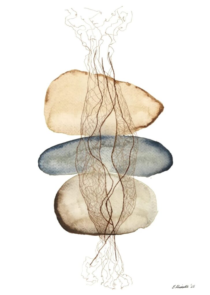 In recent years they have branched into watercolour and mixed media, maintaining their philosophy while using natures imperfect perfection as their primary muse. Using multimedia to explore mark making and self-expression, each mark is placed within deep deliberation and contemplation. Asemic writing features in their work with a goal to speak to the viewer in a non verbal way and communicate a message where words can fail. Working with the flow of the watercolour, considering the flow of nature, how everything works symbiotically and that they in turn seek their own symbiosis. Introducing ink aims to contrast and elevate each piece, demonstrating the unexpected, how it can unintentionally create something beautiful out of the darkness.
